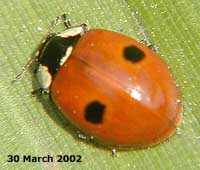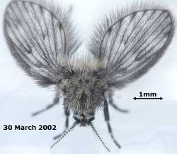 In contrast to the brightness of the lady bird, this drab little Owl-Midge (family - Psychodidae) was spotted on a window this morning. A small, hairy insect, with relatively large dull greyish wings which measure about 3mm long. Their larvae live on decaying matter. and are attracted to lighted windows. Click on the picture to see a larger version.