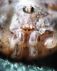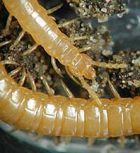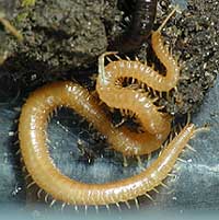 A closer shot shows the 'tail' more clearly. In addition, the legs look quite feathery, and there appear to be bristles sticking up along the millipede's back, between segments. I must blame different lighting conditions for the apparent change in colour of the body! I have still to get a close-up of the head - it is always either moving too fast or it is hidden. While trying to get that millipede close-up I managed to get this one of the tail and mid-sections of the centipede. Again, the head has so far escaped me. If you look closely at the enlarged version of the picture you may see that there are shiny rounded objects attached to two of the legs near the centre of the picture. I am wondering if these are mites or ticks. Perhaps I will look more closely tomorrow.