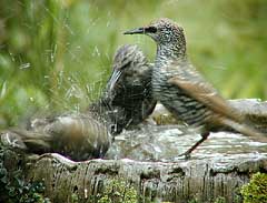 This afternoon there was what has become a very unusual event in the last year - Starlings having a communal session in the birdbath. There were five of them (and a Sparrow), but it was down to these three by the time I got my camera sorted.