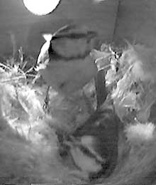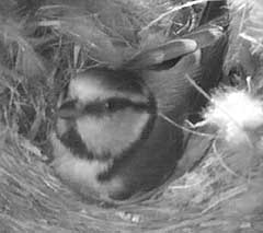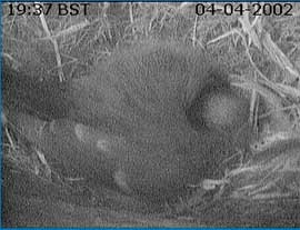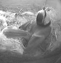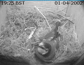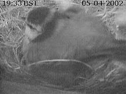 At around 6.20pm she appeared again for four visits with moss and straw. She entered again at 7.05pm and settled in the nest cup for about 4 minutes. Finally, she made a late visit to the box, as this webcam image shows. She remained in the box for a while and looked as though she may have settled for the night - until she left after 3 minutes!