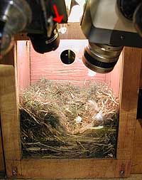 I must point out that the box is not normally brightly lit like this at night. The small object indicated by the red arrow is the Infra-red emitter that normally provides the only light source at night. Today I installed a cable from the new camera back to the computer so that I can switch between cameras when there is something interesting to look at in the nest cup!