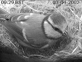 Go to latest entry.....................................Go to previous entry1 April - An interesting start to the day. After bringing what looked like hair on her first visit at 7.36am, it looked as though our female was making an early start, but in the next hour she returned just three times, only once with a bit of straw. Then, around 8.30am a series of visits (9) started when she took a bit of moss or straw out each time for the nest quarter hour. Things then went fairly quiet until after 9.30am when deliveries started up again (twenty in the next three hours). She had a funny few minutes lunchtime when on three visits she brought in moss and took out (different) pieces. Just after 1pm There was a visit by the male, quickly followed into the box by the female (as usual).