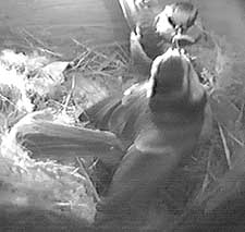 I have just seen another encouraging sign (at 2.05pm) - just after she entered the box with a bit of moss, the sound of her partner at the entrance caused her to drop the moss, spread and flutter her wings, put back her head and make a very squeeky call.