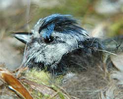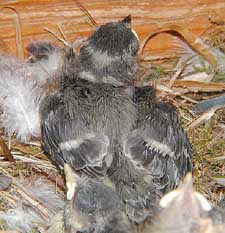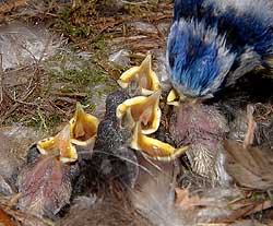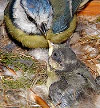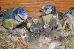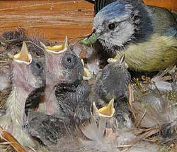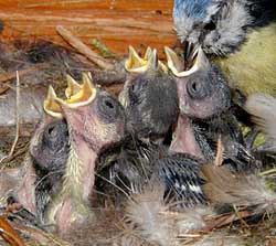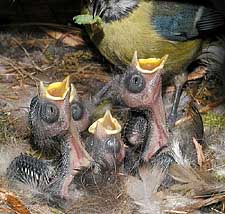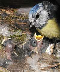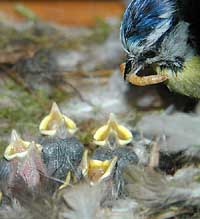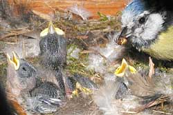 This first picture, taken at about 10.30am was taken as dad pushed a mealworm into the throat of a chick. I have included the photo because it gives a good chance to see some more detail on the developing chicks, especially if you look at the enlarged image. First, two of the chicks are showing their necks to the camera. You can see the how the central band of developing feathers ( the main tracts of growing feathers are called pterylae) is developing into the light colours of the bird's breast. You can also see two rows of dark feathers curving away to either side which will become the Blue Tit's dark collar. Three of the chicks are facing away from the camera, and in their wide gaps you can see their tongues. This webcam image from this evening gives another chance to see the development of the breast feathers, the band dividing into two as it passes down the front of the chick, second from the left. The head of the second chick from the right is almost covered by developing feathers, and you can make out the light band that will later surround the blue crown of the adult bird's head.