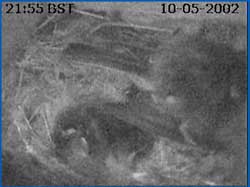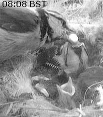 Just a brief mention of first thing this morning - By 5am mum was very restless, with the chicks popping their heads up around her. At 5.15am, two minutes after sunrise, she suddenly got up and left. Three minutes later dad arrived with the first meal of the day and for the next hour there was a constant delivery service with dad making another 25 visits and mum 16 visits, pausing in the box several times (for a total of about 12 minutes). As I write this at 9.30pm mum is again perched at the side of the nest as the chicks are very restless. The night-time webcam image is very dim again. I'm afraid I did not get round to improving the IR illumination today. I shall have to search my shed tomorrow for a couple of old remote controls so that I can use their IR LED's.