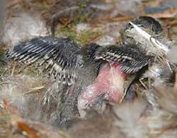 Look carefully at the left-hand chick and you can see that despite the growth of their feathers, the downy whisps present since hatching are still present on either side of the head.