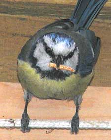 When morning comes it is back to the job of feeding the chicks. Here the male prepares to fly to the nest with a mealworm that he has just beheaded and gutted.