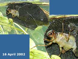 While looking at the tadpoles I spotted a couple ofdead leaves on the move. A close look revealed a cadis-fly larva. This is the first time I've seen one of these in the pond Click on the image for a larger version.