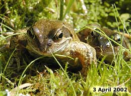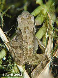 These two were watching the bank for food and were tempted up out of the water using a few mealworms. The leader has raised its body up into a potential 'strike' position and to get a better view. Unfortunately, it is not interested in something that does not move, so if the mealworm stays still for long enough the frog loses interest and goes elsewhere. Click on the image to see a larger version. In a few minutes over a dozen frogs were lined up along this bit of bank, and I spent a pleasurable time feeding them as well.