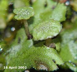 At the base of the log in the pond the Liverworts are now sending up their Umbrellas, part of their compicated reproductive system. I recorded information about these in the diary entry for 28 June 2001 |