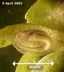 While the young newt pictured above is still with us from last Spring, the early laid eggs of this Spring are already well developed, as this picture shows. The eggs, and developing embryos are small and inconspicuous, hidden as they are under leaves or even in folded leaves. Newt egg laying will go on for a long time yet, with the eggs being deposted individually and distributed all over the pond.