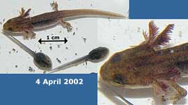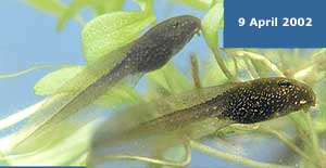 Here, to start with are a couple of images of the tadpoles whose development I have been following since their spawn was produced on 7 March. Their skin is now more mottled, they measure 15-16mm in length, and will not keep still to have their photographs taken! You can just make out their