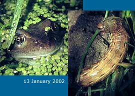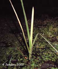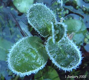 1 January 2002 - New Year's Day The year has started on a chilly note with the pond covered with ice and those plants that reach above the water's surface covered with frost. These conditions have continued all day and tonight, at 9.15pm the temperature by the pond is down to -7C, with a water temperature of 2C under the ice.