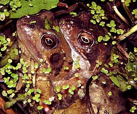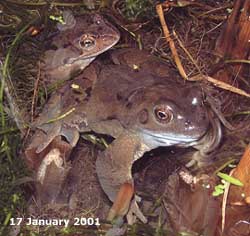 14 January - Just a short note tonight. I spent some time clearing old vegetation from both ponds, especially old Iris leaves. They are looking better already. I came across a couple of small (1st year?) frogs. I have just gone out to the pond (at 9.15pm) and spotted 12 adult frogs - 5 in the small pond, 7 in the large one. The temperatures are the same as last night. 17 January - Tonight, at 10pm I could see 14 frogs, including these two (along with 5 others) in the big pond - perhaps we are seeing the early arrivals for the Spring orgy of spawning. Last year we did not see these numbers until February. 18 January - Tonight, in pouring rain I could only see 11 frogs in the ponds at 10pm. There was no sign of any others out on land. ....... ..