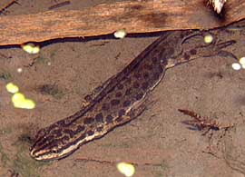30 January - Tonight's count at 8.30pm revealed 28 Frogs, all mature adults and 4 newts. 31 January - As the month comes to an end a check of the pond at 9pm revealed 31 adult frogs and 8 newts. The frogs remain almost motionless, which makes it easy to count them. However, when one moved another frog was quick to rush to it and grab it from behind. The mating urge is definitely starting to show itself. There is a lot of other activity going on among the smaller inhabitants of the pond. I spotted a Water Scorpion on the move (last pictured 14 Sept 2001). There are lots of Ram's Horn snails in evidence, as are Gammarus type crustaceans ( I must get round to photographing these). Yesterday I caught a glimpse of a diving(?) beetle, about 10mm long. |