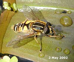 The picture shows a Helophilus pendulus resting on a leaf floating in the pond. Its body is just over 1cm long.