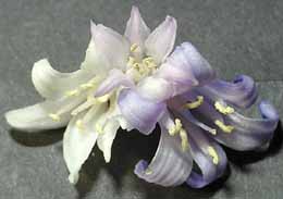 Although most of the flowers are a sort of violet-blue, we also have some white and a few pink flowered plants, as shown here. They all have cream anthers. The filaments by which these are attached are all not joined to the petals at the same height. Both these features are characteristic of the native Bluebell.
