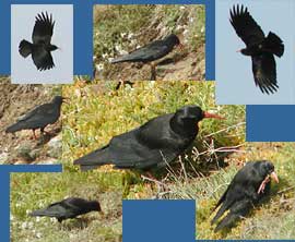 They are Choughs, a bird that forms part of the Cornish emblem and used to be so common there that they were know as Cornish Choughs. Absent from Cornwall for decades, they have started to return over the last couple of years. This was the first time I have ever seen them. The bright red beak and the wings with their splayed primary feathers really make the Chough stand out from the other members of the crow family.