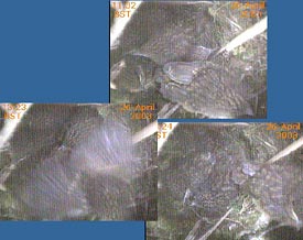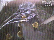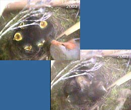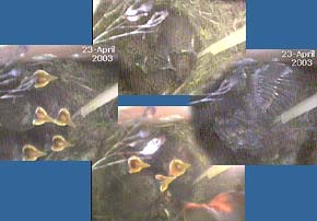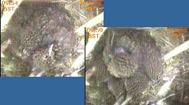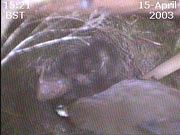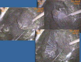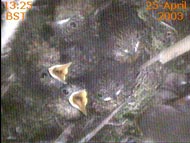 This webcam image caught the female just after she had removed a faecal sac from the chick on the left. This usually happens just after the chick has been fed - the chick turns around and positions its rear end over the side of the nest cup.