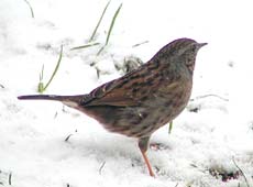 25 January - A dull, cloudy start to the day with dampness in the air was, nevertheless, brightened up by the brief appearance of a Wren by the small pond. My viewing of it hunting along the side of the garden fence was rudely interrupted by a Robin chasing a Dunnock around the lower branches of the Hawthorn. The Robin is in a very aggressive mood this morning (at 8.45am). Up to now it has been very tolerant of the presence of the Dunnocks. The sparrows seemed oblivious of this contest as they perched in the Hawthorn. However, minutes later the air was full of the noise of a couple of groups of them squabbling in what looks like competition over females. then it's all over as quickly as it started and they are back feeding again, until the next tussle! Ten minutes later and the Dunnocks are down on the ground and one is very definitely displaying with great emphasis on the flicking wings - the first time I've seen that this year.