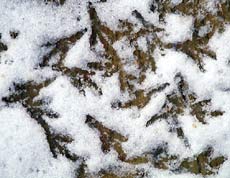 At lunchtime today our outside thermometer reads nearly 5C and the remaining snow is melting quickly - I was just in time to catch this criss-cross of mainly Blackbird footprints on our decking before they vanished into a pool of water.