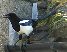 Rarely seen down in the garden, Magpies are quite frequent visitors at roof and treetop level at the moment. This one was on a neighbour's roof this morning, as it hunted for food amongst the tiles and moss. Looking a bit drab in this picture, the iridescent blue really shows up when the birds are seen in sunshine. It's a pity that their call is such a hard chattering noise.