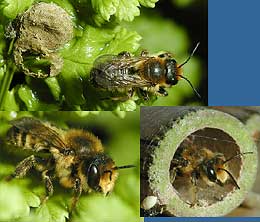 This meant that the solitary bees were not active. However, this afternoon it warmed up a little bit, enough to encourage a couple of the leaf-cutter bees to emerge for the first time. The top and left images show the first one seen to emerge. It appeared at the end of the bamboo tube with a large chunk of 'old' leaf and fell straight down. They landed on a fern frond where the bee rested for about five minutes before flying off for the first time. The lower-right image shows the second bee looking out past strands of spider silk. After resting there, it emerged, climbed along other silk threads and made its way to the top of the framework before it too took its first flight. I didn't see either of them return, and a check of the tubes this evening shows just one leaf-cutter bee (the one pictured on 28 May) in residence.