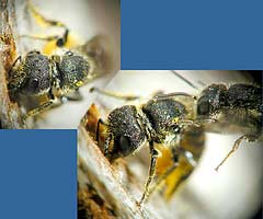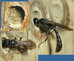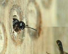 8 July - A dull but warm and humid (for us in the UK) day. Although I spent did not do much in the garden, I did spend time watching the solitary bees this afternoon. Several of the '3mm' bees were sealing the entrances of holes while others continued to bring pollen. One piece of behaviour has intrigued me. While the bees are coming and going I often see flying bees 'buzz' one that has landed and fly of without landing. While I was taking more close-ups of a bee busy sealing a hole I didn't notice the second bee (still flying) as it touched the busy bee. It was only as I looked through the images afterwards that I found that I had captured the moment!