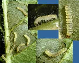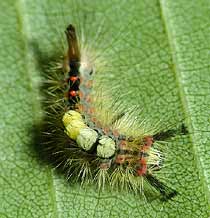 The caterpillars pictured on 4 July have disappeared. They may have distributed themselves over the Elder, but I cannot see any signs of leaf damage. This caterpillar was found on the underside of a leaf on the Birch tree this evening. I think it is the larva of the Vapourer Moth (Orgyia antiqua).
