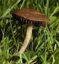 Up to now, larger fungi have been noticeable by their absence, but this one has popped up in the grass by the small pond. The cap measures about 28mm across. Needless-to-say, I'm having a problem identifying it, although I think it may be one of the Cortinarius species.