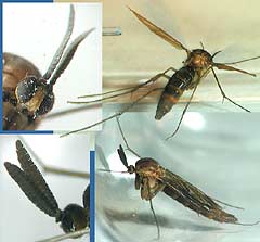 4 July - Well, with summer suspended for the last couple of days it has been cool enough to put the shorts away, and yesterday's evening meal was the first one indoors for several weeks! However, there is a good percentage of blue sky this morning so I shall be optimistic for today. This large midge came into the house last night. It was not an attractive character but its flattened antennae on a relatively tiny head made it interesting enough to justify a few photographs before it was released outside. It measured 14-15mm in length, each wing being about 10mm long. Looking in my insect guides doesn't come up with an exact match but it looks as though it belongs to the Mycetophilidae (fungus gnats).