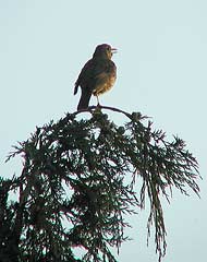 Yesterday afternoon the blackbirds were extremely agitated by something in the neighbourhood and kept up their panic calls for a long time. I have no idea what caused their distress but when I went down to behind the Leylandii to check for cats I spotted a very wobbly fledgling high up in the branches. I assume this is a recipient of much of the food the adults have been taking away over the last couple of weeks. When the panic was over the parents took raisins away again. The Song Thrush still takes raisins away, although I only saw it do this once today. Every evening we hear the Song Thrush living up to its name in the trees of the Brickfields Country Park, but this evening we had a rare treat when it spent about ten minutes singing 'on our doorstep'. It was perched at the top of a tree at the bottom of our garden, facing into the setting sun and producing a glorious sound.