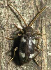Another insect becoming a 'regular' is this spider beetle (possibly Ptinus fur), measuring about 3mm long with antennae of at least the same length. Seen on the bee hotel, and also pictured there last May, it is a beetle that scavenges and breeds on dry organic matter - perhaps in old, disused bee burrows?