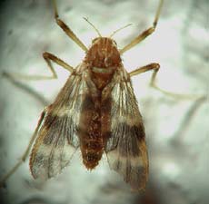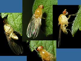 The Geranium leaves yielded not only a pair of crickets, but also a couple of these small orange flies. This is the third year that they have appeared on this same plant (June 2001, July 2002). The body is about 4mm long and they have quite long and slightly tinted wings. Using my guide books, my best guess at an ID is that they belong to the Dryomyzidae, but I would need to take a close look at the wing vein patterns for a better identification. |