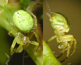 There are an increasing number of spiders appearing around the garden, most of them very small. I spotted this one hidden under the leaves of a small Oak tree I am growing in a pot. Measuring just under 4mm long the spider is a male (as ishown by the large palps at the head end - see the right hand picture). The red spot above the spinners indicates that it is probably an Araniella cucurbitina. These are common, widespread spiders.