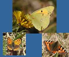 At least three brightly coloured Clouded Yellows (top image) were seen on several days, darting about between flowers. This one had somewhat ragged wings, but was the only one I could get close to. The lower images show a Small Tortoiseshell (right) and a diminutive Small Copper which must have measured an inch across at the most. I only saw each of these once and couldn't get close enough to get good images.