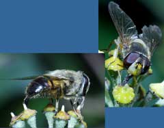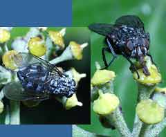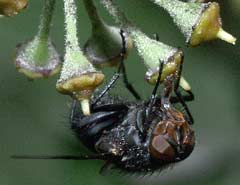 In this picture you can see how the fly's fleshy proboscis is unfolded to mop up the liquids on the flower surface.