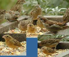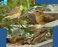 Then I suddenly realised that there was an intruder amongst them. Much smaller than the Sparrows but not intimidated by them, it is finch-like and its very short tail feathers suggest that it is a juvenile.
