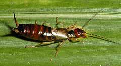 The earwigs have proved to be too elusive to photograph at the Ivy, so this picture was taken of one hunting on a bamboo plant. My presence detected, it is holding up its characteristic 'forceps' as a defence. These are the insect's cerci appendages. The fact that they are nearly straight shows that this is a female, those of a male being very curved.