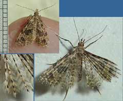 It was this small (about 8mm long), Many-plumed Moth (Alucita hexadactyla - I think). Its wings are each divided up into six plumes that look a bit like feathers. I had just had a shower and in the right-hand image you can see that the moth has it proboscis extended as it is sampling the condensation on a tile.