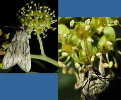 I continue to monitor the Ivy and have been disappointed by the lack of insect interest in it over the weekend. In the daytime I have seen only a few flies and the occasional bee visit. IN this close-up you can see the bee's long 'tongue' (or glossa) as it collects the nectar.