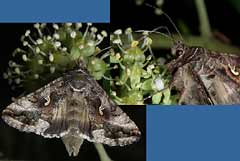Unlike the first two moths, this one continued to vibrate its wings while it fed. I think that this one is a Silver Y (Autographa gamma).