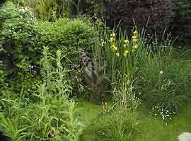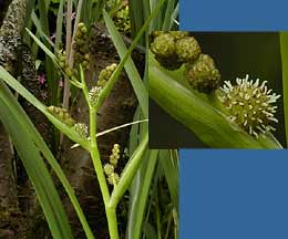 Just below the yellow Flag Irises, a very diiferent type of flower is just developing on the Branched Bur-reed (Sparganium erectum). Each group of 'flowers' has at its base one or more female heads (spiky globes with white stigmas) ripening before the smaller male heads above them.