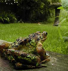After a couple of very warm days, cloud has returned and showers have encouraged many of the the frogs to venture away from the ponds in search of food. This one chose a high vantage point, on our decking, to watch for prey moving on the grass below.