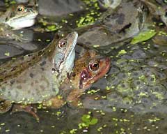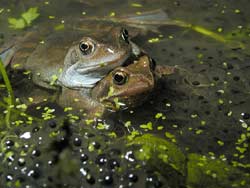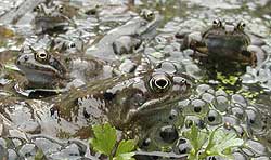 Go to latest entry.....................................Go to previous entryHeavy rain last night and more showers today have not dampened the enthusiasm of the frogs. This picture, taken this afternoon, shows just a part of the assembled mass, scrambling over the early frogspawn as they search for partners. I leave you to count the frogs. Needless to say, all the spawn I have seen so far looks healthy and fertilised. If it wasn't for the frequent showers I could spend all afternoon watching them and taking pictures, but I'll settle for this one for the moment. These two seem oblivious of the chaos around them as they prepare to add to the spawn mountain that is already forming.