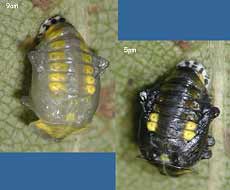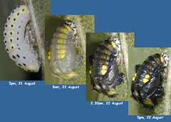 This second pair of images show the pupa from a different angle as it appeared this morning and as it was at 5pm today. In all the images taken today you can see a black and white ring around the point of attachment to the leaf. This is the skin that was shed as the larva moulted during last night. I shall try to catch the moment when the adult emerges in a couple of weeks time.
