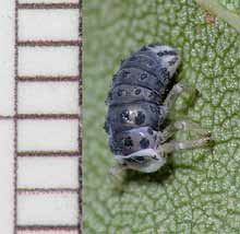 There are lots of small holes in the leaves and yesterday evening I found this sawfly larva munching away at one. The left-hand images were taken yesterday, and the lower one shows it just after moulting in the evening. The image on the right shows it this morning.