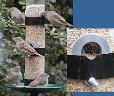 For a long time the House Sparrows have presented me with a problem. I have found that the food they like best seems to be 'Budgie Food', which consists of White and Red Millet and Canaryseed. However, the small round seeds flow out of the feeder opening far too easily and there has been a great deal of spillage. I had tried putting a large flowerpot tray below it to catch the seed, but while it has worked it has not looked too good and tends to get messy very easily.