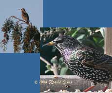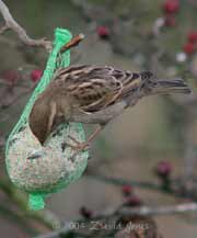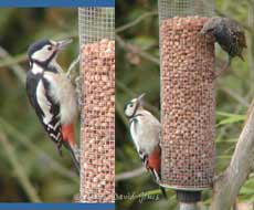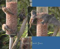 In the left hand image, two Sparrows feed on the sunny side, while a Starling takes up what seems to be a favoured, but awkward perch to get at the peanuts low down the feeder. While the Starlings seem very sociable as they gather on the rooftops or branches, they become possessive once on the feeder, seeing off any other that tries to share (right image).