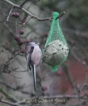 Later on I was caught unprepared when four Long-tailed Tits turned up to feed on that and another fat ball that are hanging from branches on the Hawthorn. This was the only grabbed image I managed before they flew off.